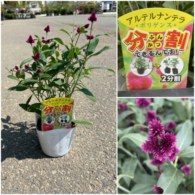千日紅・ラブベリーフィールド、アルテルナンテラ・ポリゲンス「分割できるんです!」、段菊(青)、シュウメイギク・ハドスペン(ピンク)、磯菊、トウガラシ・オニキスレッド、マリーゴールド、ノボタン、ペンタス