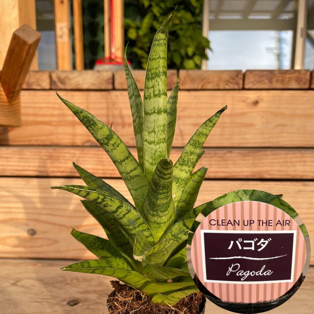 | 葉が波打つように何層も重なり合い、立体的なタワー型(仏塔:パゴダ)に見えるのが特徴の品種。 | 細くすらっとした棒状の葉が特徴で、濃淡のある緑色のボーダー柄が美しい品種 |