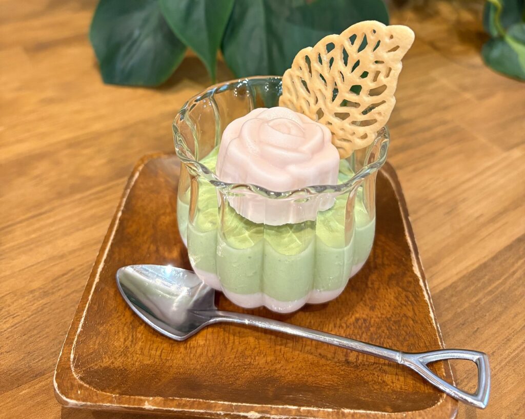 かわいいピンクのバラはいちご味のババロア、グリーンは抹茶味のババロアです🍮
